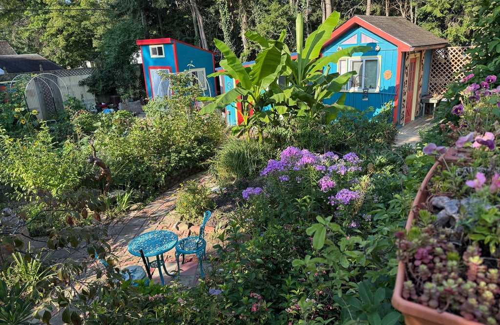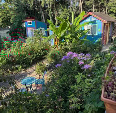 Our Garden is a 35 year collaborative work my husband, Larry Bechtel, and I have been involved with. We married, bought this house and got a dog. That was 35 years about. Then there was just a yard and now this jungle. It is a big part of the dance of our marriage. We both love it, find inspiration in it, and like to be in it. So we put our studios where we could be.